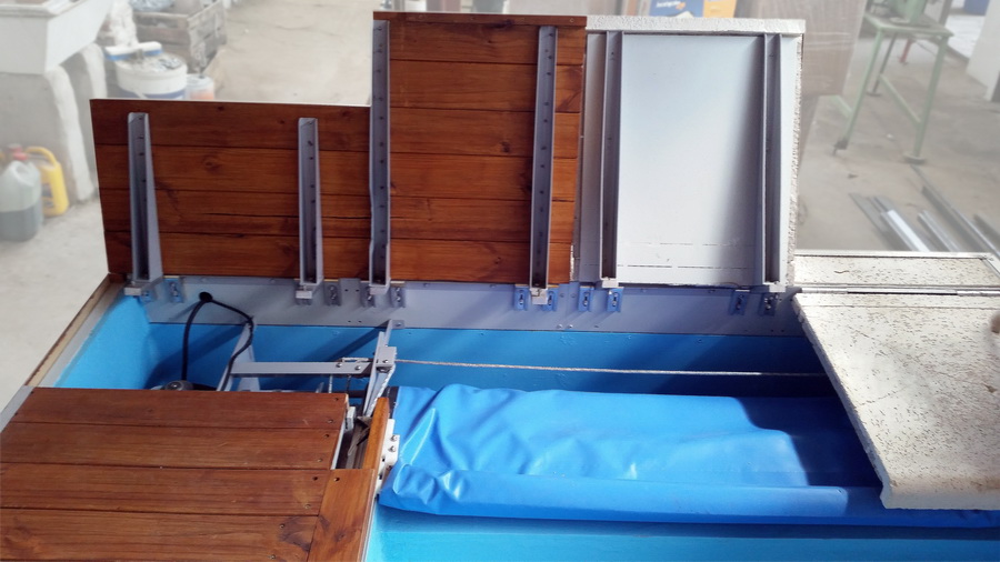 Todas nuestras cubiertas estan equipadas con una bomba especialmente diseñada para cubiertas de piscina. Esta bomba desagota automaticamente el agua de lluvia que pueda acumularse sobre la misma.