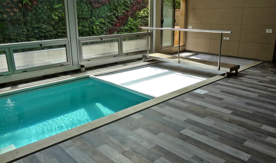 El cobertor automático y el semiautomático a taladro, pueden ser colocados bajo nivel del piso, quedando oculto el mecanismo y los rieles, brindando una armonía visual con el entorno, y sin que nada delate la presencia del cobertor, realzando la belleza natural de piscina.